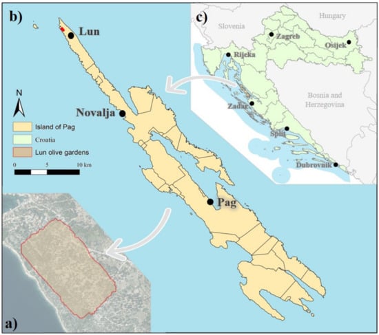 Figure 1. Study area: (a) Test area in Lun olive gardens; (b) island of Pag; (c) Croatia.