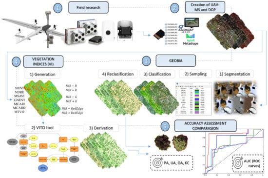 The research methodology comprises the next steps: field research and data collection (1); creation of UAVMS and digital orthophoto (DOP) (2); the GEOBIA analysis (3), the proposed method based on VIs (4); approaches accuracy assessment comparison (5) (Figure 2).