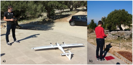 Figure 3. Field work; (a) Trinity F90+ MS mission; (b) Trimble R8s CPs and RP collecting.