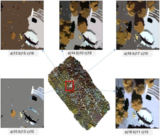 The second step in the GEOBIA process of extracting olive tree canopies is segmentation, a process based on the Mean shift approach implemented in ArcGIS. The Segment Mean Shift tool identifies the characteristics or segments in images by clustering pixels with similar spectral, spatial, and geometrical characteristics. The image segment characteristics are determined by the spectral detail, the spatial detail, and the minimum size of the segment. An iterative process was used to optimize the values of the aforementioned parameters (n = 42). Based on the visual interpretation of the UAVMS segmentation results, the best combination of parameter values was chosen (Figure 4).