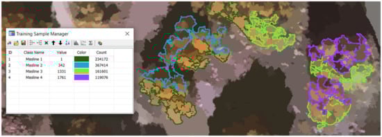 The third step refers to adding test samples to the segmented model. Select Segment tool within the Training Sample Manager was used to add samples. When adding, the appropriate number of classes that will represent the research object, as well as the number of other classes within the observed area, is optimized. The research object, i.e., the olive tree canopies, was collected within four classes (Figure 5), mostly due to the morphology and the solar incidence angle, which caused differences in the spectral reflection within the canopies.