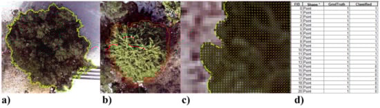 The first step involved the vectorization of nine RT and nine FT from very high-resolution DOP (Figure 6a,b). The next step involved creating a point layer for each pixel, i.e., fishnet within the RT and FT polygons (Figure 6c). Furthermore, for each point, an attribute is added within the attribute table, which refers to the actual value of the point on the ground (0 or 1) (Figure 6d). Validation polygons were created using VHR DOP with a spatial resolution of 1.88 cm.