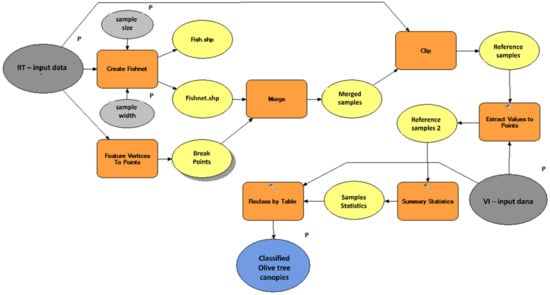 The proposed VITO (vegetation index threshold optimizer) tool was created to automate the process to separate olive tree canopies using selected VIs. As input data, the VITO tool primarily uses previously vectorized polygons of olive tree canopies. First, by using the Feature vertices to Points tool, the breaking points of the olive canopies are extracted. This layer of points represents the outer part of the olive tree canopy, while the inner part is generated with the Create Fishnet tool, as a layer of regularly spaced points. Both sets of point layers are prepared for merging as they represent reference samples for the second part of the tool. On the other side of the tool scheme, the VITO tool uses a chosen VI model as input data, after which the model values are added to the recently merged layer of points. To utilize the Reclass by Table tool, which uses statistics to produce output results in the form of classified olive tree canopies, all extracted data is documented in the form of a table, using the Summary Statistics tool. After the reclassification process, the final result of the VITO tool is extracted olive tree canopies (Figure 7).