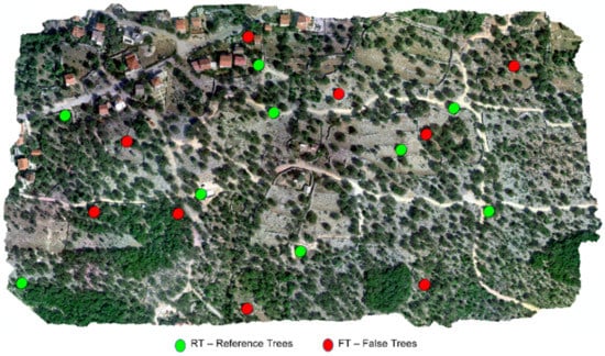 where pii represents the major diagonal element for class I, pi+1 represents the total number of observations in column I (bottom margin), pi+ represents the total number of observations in row I (right margin), and m represents the number of rows and columns in the error matrix. PA, UA, and OA values range from 0 to 1. A higher value indicates greater precision. Accuracy assessment was performed using layers of regularly spaced points generated within polygons representing reference trees (RT) and false trees (FT). This method ensures hundreds of thousands of samples are positioned within the RT and FT, insuring the most accurate results [62,63].