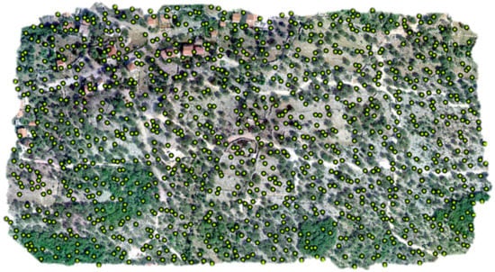 The second way of comparison was carried out using a layer of one thousand randomly distributed points (Figure 9) created using the Create Accuracy Assessment Points tool. Points are also randomly distributed within the research area. For each point, based on the very high-resolution reference DOP, an attribute was added that indicates the real belonging to the class in space, i.e., 0 for the other class and the value 1 if the point in the research area is inside the olive tree canopy. Using the same tools as in the first comparison method, confusion matrices and ROC curves were created, which contain the results of the accuracy measures used.