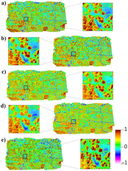 Figure 12. VIs models: (a) NDVI; (b) NDRE; (c) GNDVI; (d) MCARI2; (e) RDVI2.