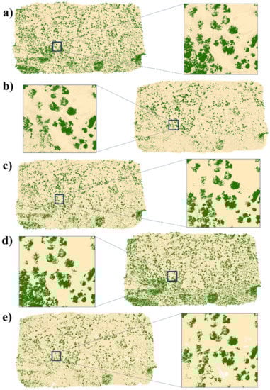 Figure 13. VIs classified models: (a) NDVI; (b) NDRE; (c) GNDVI; (d) MCARI2; (e) RDVI2.