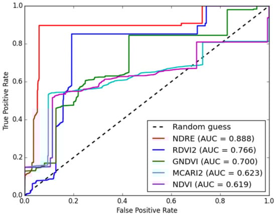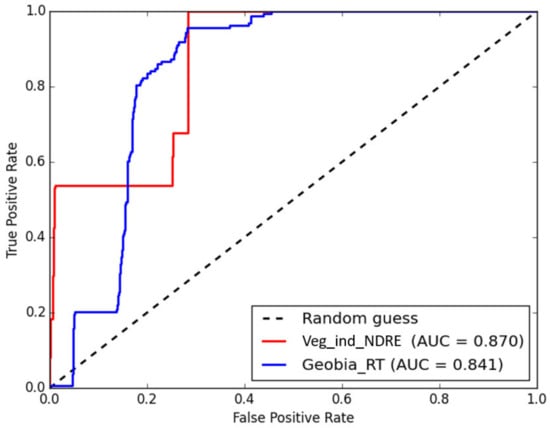 The accuracy of the VIs olive tree canopies models was accessed using AUC (area under the curve) values obtained from ROC (receiver operating characteristics) curves. ROC curve is a graphic diagram that illustrates the diagnostic ability of a certain classifier system, and it is created using TRP (true-positive rate) and FPR (false-positive rate) values of the observed model [64,65]. ROC curves are commonly calculated by either utilizing the design sample reuse approach or by applying the classification rule to a test set of points with known classes. While the AUC represents the possibility that a randomly selected member of class 1 will have a lower estimated chance of being a member of class 0 than a randomly selected member of class 0 [66]. ROC or AUC are often used wherever it is necessary to verify or visualize the performance of multi-class classifications [67]. The creation of ROC curves and AUC values is a fully automated process using the Calculate ROC Curves and AUC Value tool, which was integrated into ArcGIS within the ArcSDM Tools set.