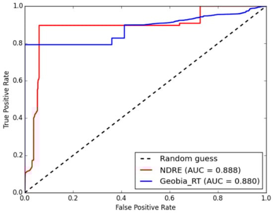The approach based on VIs shows slightly better results in terms of extracting the olive tree canopies compared to the GEOBIA approach, according to five measures of accuracy. In the method of testing the accuracy with the use of regularly distributed points within the RT and FT, the VIs showed better results in four of the five measures used. According to the measures of AUC (Figure 15), PA, UA, and KC, the approach based on VIs is more accurate, while the GEOBIA approach showed slightly better results only in the measure of OA (Table 3).