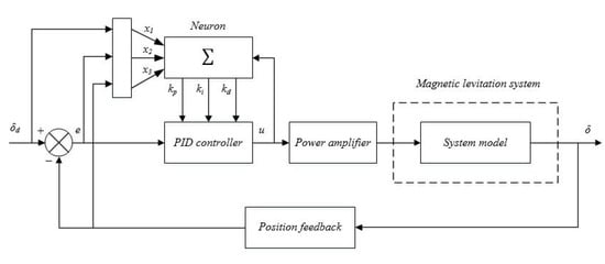 According to the control models and stability control requirements of the second-order system, neural network PID control is adopted by the magnetic levitation actuation and motion control system actuated, the principles of which are based on force imbalance control theory. The system control block diagram is shown in Figure 4. The proposed controller is a PID controller with adjustable parameters that are determined by neural network.