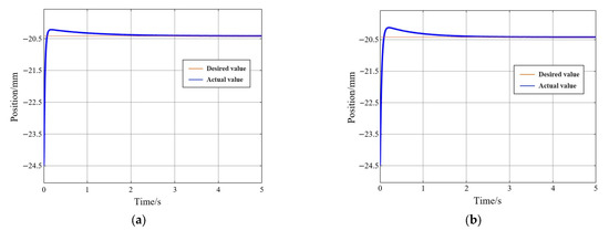 Step response simulation of different controllers with the same electromagnetic actuation structure. (a) Step response simulation of neural network PID controller; (b) Step response simulation of model-based controller.