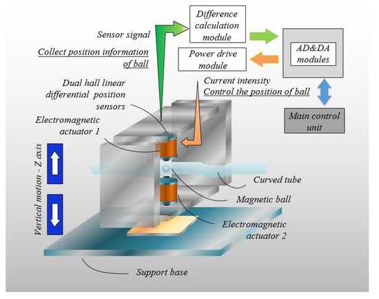 The magnetic levitation actuation and motion control system based on force imbalance consists of a main control unit, power supply modules, electromagnetic actuators, input control modules of current, PWM output modules, differential calculation modules of signals and A/D modules of input signals. The schematic diagram of the magnetic levitation actuation and motion control system based on force imbalance is shown in Figure 1. The electromagnetic actuator adopts dual electromagnets with a symmetrical layout to generate a superimposed magnetic field to attract the control component of a permanent magnet ball. The system forms a feedback closed loop through the position signals and current signals collected by sensors, so that the control component can move according to the required path and accuracy, thereby realizing the operation and control of the permanent magnet ball in a non-liquid environment. During the actuating process, the ball can move with variable speeds and controllable trajectory.