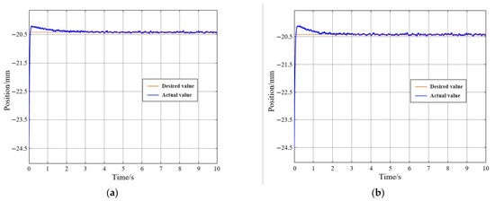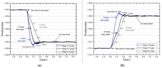For step-by-step actuation control, when the permanent magnet ball directly responds to a large step input signal, due to the non-linear relationship between electromagnetic force on the permanent magnet ball exerted by the actuators and levitation gap, the ball is prone to drop out of control. In addition, the significant overshoot means that the controlled object’s dynamic and static characteristics are not stable and accurate. In order to study the effect of different step inputs on the motion performance, the step inputs are set to 1.0 mm, 0.5 mm and 0.2 mm, respectively. The test results are shown in Figure 11 for the descending motion of the permanent magnet ball from the −19.40 mm to the −20.40 mm and the ascending motion from the −20.40 mm to the −19.40 mm.