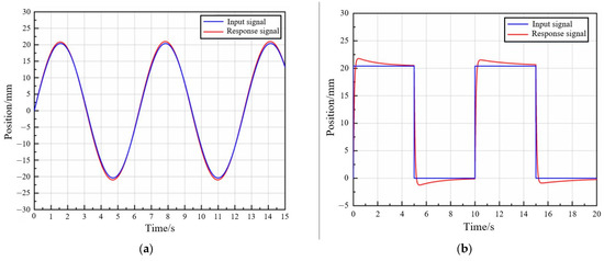 In order to better observe the control effect of the neural network PID controller, the sine signal of T = 2π s and square wave signal of T = 10 s are used to track and analyze the characteristics of the controller. The simulation results shown in Figure 10 show that the input signal responded well to the control system, and the stable levitation control of the controlled object can be achieved well. The system has a fast response speed and a small tracking error, so it has good dynamic and static performance.