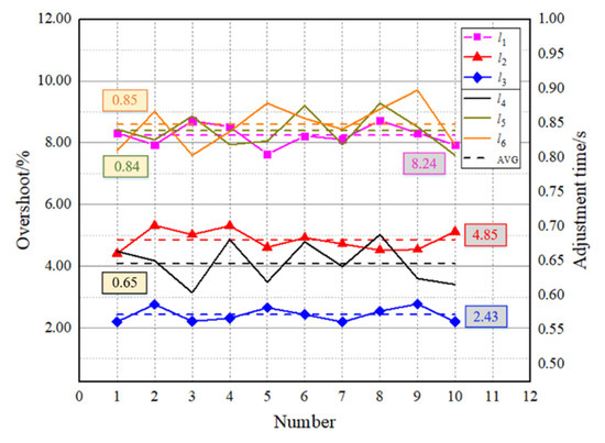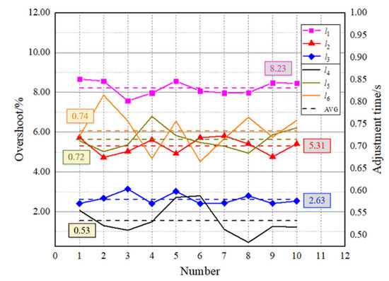 According to the test data in Table 2 and Table 3, plot the change curves of the overshoot and adjustment time of three step inputs in the descending and ascending motion process shown in Figure 12 and Figure 13. The repeatability test results of the descending motion are consistent with the test results shown in Figure 11a, and the repeatability test results of the ascending motion are consistent with the test results shown in Figure 11b. In Figure 12 and Figure 13, l1 represents overshoot of 1.0 mm step input, l2 represents overshoot of 0.5 mm step input, l3 represents overshoot of 0.2 mm step input, l4 represents adjustment time of 1.0 mm step input, l5 represents adjustment time of 0.5 mm step input, l6 represents adjustment time of 0.2 mm step input. Dotted line AVG denotes average value.