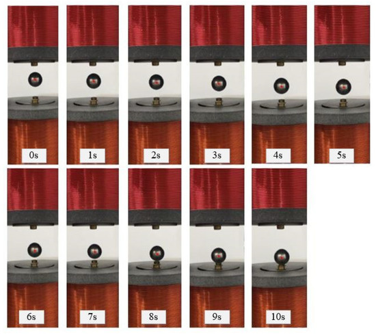 The test conditions will become inconsistent due to the difference between the simulation model and the actual model. The difference between test results and the simulation results is caused by the shape errors and test condition errors, but the errors are within the allowable range. The actually stable levitation effect of the permanent magnet ball is shown in Figure 9.