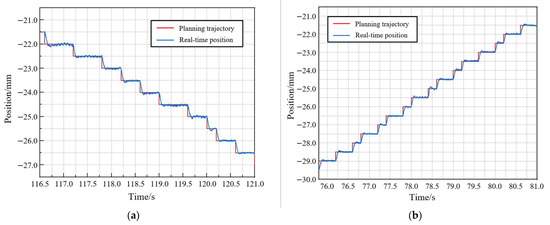 It can be seen from Table 3 that during the descending motion, and compared with the 1.0 mm step input, the overshoot of 0.5 mm step input is reduced by 37.3% and the adjustment time is increased by 34.3%. Compared with the 1.0 mm step input, the overshoot of 0.2 mm step length is reduced by 75.4% and the adjustment time is increased by 37.9%. It can be seen from Table 3 that during the ascending motion, and compared to the 1.0 mm step input, the overshoot of 0.5 mm step input is reduced by 42.7% and the adjustment time is increased by 29.7%. Compared to the 1.0 mm step input, the overshoot of 0.2 mm step length is reduced by 74.9% and the adjustment time is increased by 31.1%. The 2 pairs of 10 sets of repeatability test data meet the 3σ criterion.