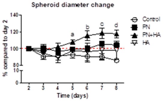 Spheroids were cultured on special cell-repellant culture plates and followed up for eight days. We measured spheroid diameter in vehicle-treated samples (Control) and compared it to Polynucleotides alone (PN), Hyaluronic acid alone (HA), or Polynucleotides in combination with Hyaluronic acid (PN + HA) groups, expressed as a percentage of the initial diameter. a = p < 0.05 PN + HA vs. all groups; b = p < 0.01 PN + HA vs. all groups; c, d = p < 0.001 PN + HA vs. all groups.