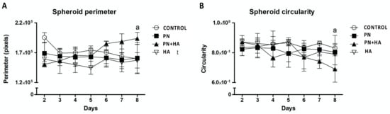 To better characterize the morphological changes of spheroids under different conditions, we acquired microphotographs of the spheroids and analyzed them using the freely available software ImageJ. Consistently with the measurement of their diameter, the perimeter of control spheroids remained overall stable from day 3 to day 8 of culture, though a significant drop was observed between days 2 and 3. No effect on cell perimeter was instead observed for cells stimulated with PN or HA alone. In contrast, the perimeter of spheroids stimulated with PN + HA gradually and significantly increased (Figure 2A). We also assessed spheroid circularity, a shape parameter that ranges from 0 to 1, with 1 meaning a perfect circle and 0 a line. As expected, spheroids generally fared quite high (around 0.8) on this scale, as they tend to be circular structures. Somewhat in agreement with the preceding observations, no changes in shape were detected during the eight-day observation period for Control, PN or HA samples. We, however, observed a significant and progressive decrease in circularity in PN+HA samples, indicating that the cell clusters became less circular, because of the presence of localized growth spurs, which were visible as small cell heaps protruding out of spheroids along their perimeter (Figure 2B).