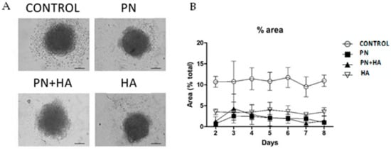 A well-visible feature of control spheroids in culture was that a thick cloud of particles appeared around the spheroid soon after seeding (Figure 3A) and remained throughout the experiment. These particles can be interpreted as cell debris, as they did not appear to be compatible with whole cells (based on shape and size), nor with living organisms (based on metabolic assays, data not shown). The amount of this debris remained quite constant during the whole experiment. Such particles were not observed around all spheroids, but they were more abundant in control samples (Figure 3A). Treated samples did not present nearly as many particles, although samples with HA tended to have slightly more particles than PN-treated spheroids. We quantitated the particle-covered area around the spheroids using ImageJ and plotted it (Figure 3B).