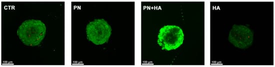 We then moved on to investigate cell viability within spheroids, as it can be challenging for cells to remain viable in these constructs, due to uneven access to nutrients in the different parts of the spheroid because of its morphology. To do that, we stained spheroids with calcein-AM, a dye that becomes fluorescent only after being internalized and cleaved by viable cells, or Propidium Iodide, a compound that, on the contrary, can pass the cell membrane and enter cells only if they are dead, and observed the samples using confocal microscopy (Figure 4). Cells in spheroids appeared viable, without detectable dead cells, and outer cells tended to be more strongly labeled than those insides. A stronger fluorescent signal of calcein in the peripheral area of spheroids has been previously described in the literature and appears to be associated with higher esterase activity of the cells in the outer layer of the cluster [21]. Fluorescence, however, appeared more intense in PN + HA-treated samples, as compared to HA-treated spheroids, and even when compared to PN alone (Figure 4).