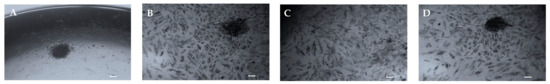 Microphotographs of spheroids stimulated with (A) vehicle, (B) Polynucleotides, (C) Polynucleotides and Hyaluronic acid, (D) Hyaluronic acid, after re-plating into regular culture plates and cultured for 15 days. Spheroids that had been previously cultured in PN + HA dissolved completely after replating and their cells colonized the new plate. Spheroids previously cultured under different conditions were mostly retained, although some of their cells did spread out and grew on the new plates. Magnification 4×. Bar = 50 μm.