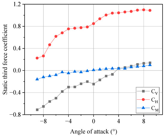 The static three-component force coefficient including the drag coefficient, lift coefficient, and torsion moment coefficient of the main beam section in Equation (1) is obtained from the segmental model wind tunnel test. For the cross-section of the main beam in the Xiangshan Harbor highway cable-stayed bridge, the variation curve of the aerodynamic force coefficient with the wind attack angle [21] is shown in Figure 2.