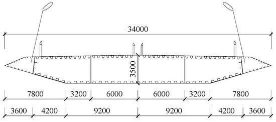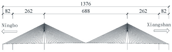 The main bridge of Xiangshan Harbor Bridge in Ningbo City in China is a five-span continuous semi-floating cable-stayed bridge with double towers and double cable planes in Figure 4. The main girder section is a streamlined closed steel box shape, the detailed sizes are marked in Figure 5, and the bridge tower is diamond-shaped. The auxiliary pier and transition pier are rectangular thin-walled types. The foundations of the bridge tower and piers are all bored pile foundations. Vertical and lateral bearings are set between the cable tower and the main beam, and viscous dampers with the function to limit displacement are installed in the longitudinal direction. In this analysis, the limit of dampers on the longitudinal motion of the main beam is ignored, and the main beam is only restrained in the lateral and vertical directions. The longitudinal sliding bearing is set on one side of the transverse bridge direction between the main beam and the transition pier and the auxiliary pier, and the longitudinal sliding bearing on the other side can limit the lateral relative movement at the same time, so it is simplified to constrain the main beam in the lateral and vertical directions, and only coupling the degrees of freedom in the lateral and vertical directions when building the finite element model. And the bottom of the cable tower and piers is consolidated to constrain all degrees of freedom.