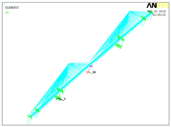 The finite element model of Xiangshan Harbor Bridge is established by ANSYS software. This bridge is simulated as a single-ridge girder model as a “fish bone spur” form. The whole modeling process is finished by APDL (ANSYS Parametric Design Language). The main beam, bridge tower, and piers are simulated by BEAM188 element which can give the cross-section shape, the connection between the main girder and stay cables is realized by rigid arms that are modeled by BEAM4 element with high rigidity. The stay cables are modeled by the LINK10 element, and the ballast and the second-stage dead load are substituted by the mass point MASS21 element. The connection between the main beam, the bridge tower, and the pier is simulated by coupling constraint, and the bottom of the bridge tower and bridge piers are consolidated. The complete finite element model of Xiangshan Harbor Bridge is shown in Figure 6.