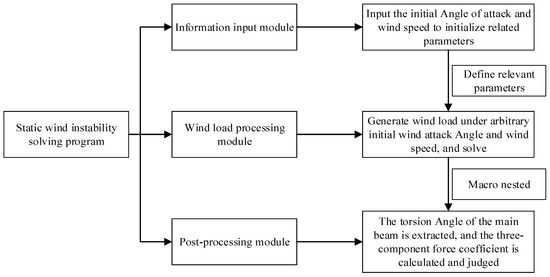Combined with the finite element model of the Xiangshan Harbor cable-stayed bridge established in Section 4.1 and the internal and external -two-iterative method for static wind instability analysis of the bridge in Section 2.1.2, the calculation program including three modules which are the information input module (AVINPUT), wind load processing module (WIND_SOLVE) and post-processing module (JUDGE) is written to automatically analyze the static response of the bridge and judge the convergence, the analysis interface is also developed on basis of APDL in ANSYS software. The flow chart of this program is shown in Figure 7.