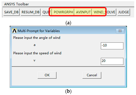 When calculating the aerostatic instability wind speed, it is necessary to frequently call the information input module, wind load processing module, and post-processing module. But it is time-consuming, inefficient, and very cumbersome to call these modules simply by command flow. Therefore, the above three modules are created as toolbar buttons. When these buttons are clicked, the corresponding module program can be run, thereby realizing the parameterized customization of the toolbar and greatly improving the operating efficiency of the program. After defining the toolbar, the defined toolbar is displayed under the ANSYS Toolbar menu, as shown in Figure 8a. Click the button to realize its corresponding operation, as shown in Figure 8b.