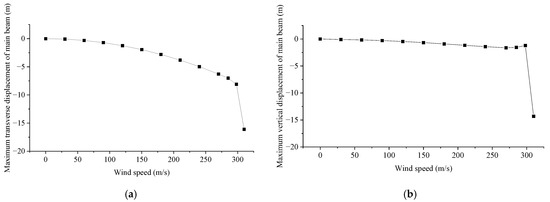 Taking the initial wind angle of attack as an example, the calculation process of the aerostatic instability wind speed is described. According to the given wind speed solution strategy for static wind instability in Section 2.1.2 and the above program modules, the variation curve of the maximum displacement of the main beam with the wind speed can be plotted, as shown in Figure 9, where it can be seen that the maximum displacement of the main beam increases nonlinearly with the increasing wind speed. When it is close to the instability wind speed, the displacement increases sharply, and the instability wind speed can be inferred according to the changing trend of the displacement. When the initial wind angle of attack , the instability wind speed is 298 m/s, which is unlikely to reach in a practical environment. However, for some bridges, the wind speed of aerostatic instability is much smaller, and the static wind stability even becomes the limiting factor of bridge wind-resistant design. Some examples are given in Ref. [5]. Therefore, this paper provides a method for static wind instability analysis, which can be used for all bridges. Of course, due to the limitations of software and models, some factors such as strength failure are temporarily ignored, where such high wind speed may have caused static failure to the bridge structure.