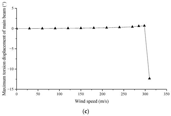 Variation curves of the maximum displacement of the main beam with wind speed. (a) Transverse displacement; (b) Vertical displacement; (c) Torsion angle.