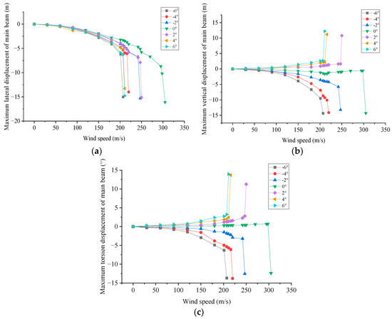 Maximum displacement curve of the main beam with wind speed under different initial wind attack angles; (a) Lateral displacement (b) Vertical displacement; (c) Torsion angle.