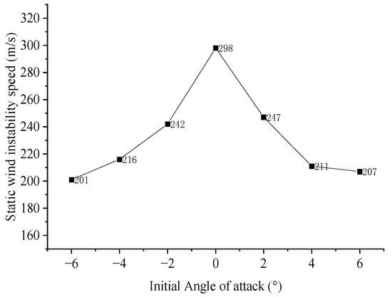 The aerostatic instability wind speed when the initial wind angle of attack is given above, but in engineering practice, the angle of attack between the incoming wind and the bridge is not necessarily . And the wind angle of attack is an important factor affecting the critical instability wind speed because the three-component force coefficient for calculating wind load is closely related to the wind angle of attack from Figure 2 where it can be seen that the three-component force coefficient is very different under different wind attack angles. In summary, it is necessary to study the influence of the initial wind angle of attack on static wind stability. There are some studies about the range of initial wind attack angles. He [29] pointed out that the wind angle of attack in the atmospheric boundary layer may vary slightly at the range of −3° to 3°. Han [23] selected the initial wind attack angles as −2°, −1°, 0°, 1°, 2°, and 3° to calculate and compare the critical wind speed for static wind instability of the Second Yangtze River Bridge in Fengdu. To discuss the impact of the initial wind angle of attack more deeply, in this research the initial angle of attack as −6°, −4°, −2°, 0°, 2°, 4°, and 6° are chosen to calculate the aerostatic instability wind speed, respectively.
