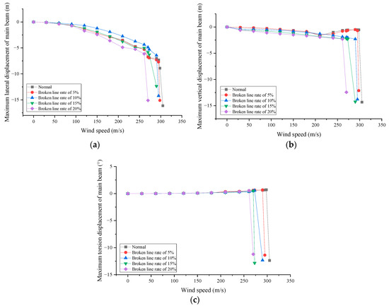 Maximum displacement curve of main beam with wind speed under different wire breakage rates; (a) Lateral displacement (b) Vertical displacement; (c) Torsion angle.