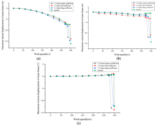 Due to the randomness of the wind field and the fluid-structure interaction during the use of the bridge, the magnitude of the static three-component force coefficient will also fluctuate accordingly. These coefficients obtained by boundary layer wind tunnel test or numerical simulation also are random. It is very important for the static wind load calculation, and the static wind load is closely related to the static wind instability of the bridge. Therefore, it is necessary to discuss the sensitivity of the static three-component force coefficient to the static wind instability of the bridge. In this research, the static wind stability of the Xiangshan Harbor Bridge is respectively explored when only the moment coefficient is expanded to 1.2 times, and other parameters remain unchanged, or only the lift coefficient is expanded to 1.2 times, or only the drag coefficient is expanded to 1.2 times, to analyze the displacement response of the bridge and obtain the critical instability wind speed. The comparison of the maximum displacement of the main beam under different cases is shown in Figure 14. The critical instability wind speed of Xiangshan Harbor Bridge under different cases is listed in Table 2 at the initial wind attack angle of 0°.