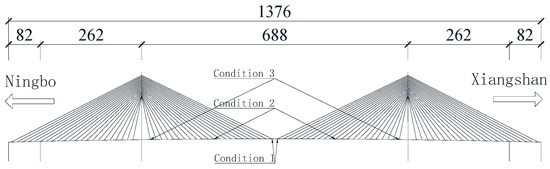 During the use of the bridge, the stay cable will lose its function entirely (or called stay cable broken) due to the occurrence of some special circumstances or replacement of stay cables. To discuss the influence of the stay cable broken position on static wind stability, there are three cases about the broken position of the stay cable, that is, the stay cable breaks in the middle position of the main span, in the quarter position of the main span and near to the bridge tower, and they are called Condition 1, Condition 2 and Condition 3, as shown in Figure 15. The comparison of the maximum displacement of the main beam under different conditions is shown in Figure 16. The critical instability wind speed of Xiangshan Harbor Bridge under different conditions is listed in Table 3 at the initial wind attack angle of 0°.