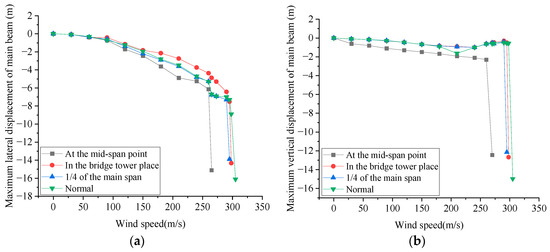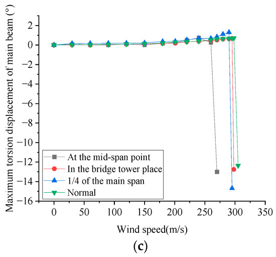 Maximum displacement curve of main beam with wind speed under different broken positions of the stay cable; (a) Lateral displacement; (b) Vertical displacement; (c) Torsion angle.