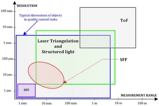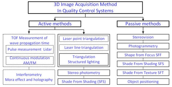 The food industry, for example, is seeing the introduction of vision systems at every stage of production. The reception of raw materials into production is currently carried out using sorting systems for materials classification. For example, sorting fruit and vegetables described in the literature often occurs during harvesting. The first sorters worked using classical image analysis algorithms on monochrome and color images [35]. Subsequent solutions used infrared imaging [36]. With the development of neural networks, solutions using this method for fruit quality classification have appeared [37]. All systems, regardless of the imaging method used or the image analysis algorithm employed, work within the TQM framework and ensure the quality of the raw material received for production. A similar development of vision technology has been observed in the woodworking industry. The first scientific papers and implementations discussed using 2D monochrome and color images for wood surface analysis and surface defect detection using classical image analysis algorithms [38]. Subsequent studies extended the measurement methods to 3D solutions [39]. These were used, among others, to study wood growth and assess the wood surface defects [40,41]. The next phase of developing vision systems in the industry saw implementations using machine learning methods [42]. However, the most dynamic development of vision systems was observed in the automotive sector. It can be assumed that every newly designed production line and the technological station is equipped with a set of vision systems controlling the manufactured product and process parameters. Vision systems (2D and 3D) are used together with industrial robots to locate semi-finished products in bins and conveyor belts. They are therefore involved in the production process. In addition, they are also used in product inspection operations, where they carry out measurement tasks [43,44]. Within the scope of 3D imaging, control and measurement systems based on laser triangulation, stereovision, and the TOF method are applied in production processes [45,46,47,48] (Figure 1).