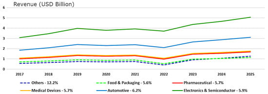 The trend of introducing vision measurement and control systems to production lines observed in recent years will also continue in the years to come. According to the Frost and Sullivan report [52], the automotive industry will still have the largest share. However, the second and third places will be taken by the pharmaceutical and medical industries. This information is referred to in the year 2020 as the base (Figure 2). One of the constraints on the development of vision-based quality control systems is the variability and intermittent difficulties in the availability of high-resolution matrices with the parameters needed to build measurement systems. For example, the impact of COVID-19 on the production of components for vision systems can be seen in 2021–2022.