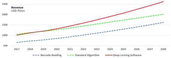 At the same time, the approach to the construction of quality control algorithms used in vision systems is changing. There is a very high demand for new AI solutions that enable a change in the approach to preparing a product quality control algorithm. Based on the use of AI algorithms, deep learning is being used in the preparation of applications that enable the identification of product defects. The development of such algorithms can be seen in the historical data and development forecasts available in the report published by Grand View Research Inc. [55]. Since 2018, an increase in the development of software-based deep learning has been observed (Figure 4).