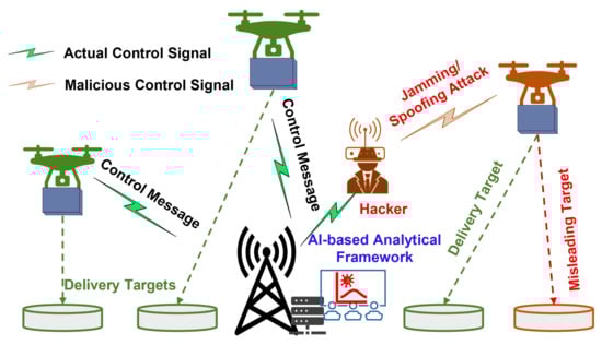 We consider a delivery urban air mobility infrastructure in a wireless network, where RF signals and their sensory observation autonomously control the delivery drones as shown in Figure 1. Jamming and spoofing are the most common attacks for commercial UAM. The attacker attacks to steal the UAV and corresponding delivery goods, while in some cases, the intention is to crash the UAV. We consider that is N-dimensional data that control the UAM attitude and a binary variable , where denotes an attack; otherwise, it is 0. Using the observation of historical UAM operational data, we can train the AI model. Consider each historical observation labeled with a binary indicator . Then, we can define the AI model as a function of historical observation , given the label . The learning model can defined as follows: