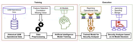 The security analyzer utilizes a training model for ensuring cyber-physical safety for commercial UAM. In particular, based on the analysis of real-time UAM operational data through the trained AI model, the security analyzer can predict and find the cause of security threats by deploying the Pearson’s correlation coefficient [15]. The proposed framework is trained offline via historical operational data and executed in real time by using a trained model and current UAM operational data.