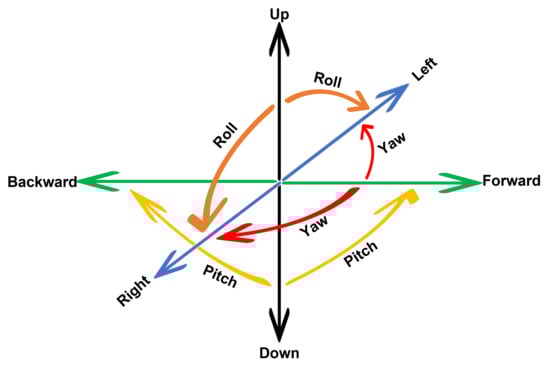 Illustration of six degrees of freedom by yaw, pitch, and roll for UAM attitude control.
