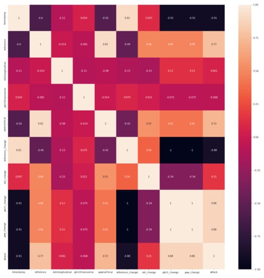 In this work, our goal is to develop an AI-enabled analytical framework to predict and protect UAVs from cyberattacks and crashes. Therefore, we consider the data that include the behavior of a UAV’s attitude [6,25] and their changes in Equation (1) so that we can proactively detect abnormal attitudes caused by jamming or spoofing attacks. Therefore, it is imperative to build an analytical model based on the outcome of Equation (1) to proactively manage a UAV under a cyber-physical threat. In this work, we consider the Pearson’s correlation coefficient [15] to analyze an upcoming event . The Pearson’s correlation coefficient [15] model for current UAM observation is formalized as follows: