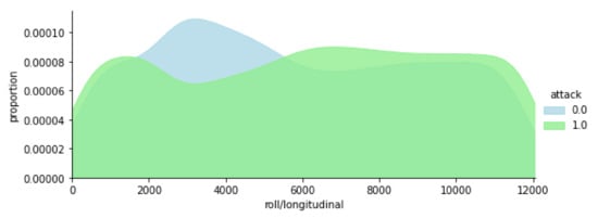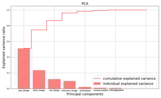 We illustrate a correlation matrix between attacks and UAM attitude control parameters in Figure 4. Figure 4 shows a strong correlation among attacks and UAM attitude parameters such as yaw (), pitch changes (), and yaw changes (). Figure 4 also demonstrates a roughly negative correlation between spoofing or jamming attacks and the timestamps. In summary, in Figure 4, we found that the attack data had a strong positive correlation with two measurement changes, which were the transverse and roll changes and the vertical and yaw changes, while the attack data had a strong correlation with one sensor measurement: yaw motion. Furthermore, we show the principal component analysis (PCA) of the considered dataset in Figure 5. Figure 5 also provides evidence of the prominent effects of pitch changes, yaw changes, and roll changes on spoofing or jamming attacks.
