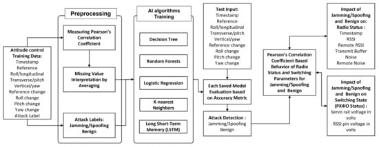 We illustrate a block diagram of the overall methodology with the inputs and outputs in Figure 6. We considered UAM attitude control parameters such as the input timestamp, reference point, roll and longitudinal, transverse and pitch, vertical and yaw, reference change, roll change, pitch change, and yaw change inputs as shown in Figure 6. The inputs were prepossessed by missing value interpretation and adding a label of jamming or spoofing and benign. We implemented decision trees [9], random forests [10], logistic regression [11], KNN [12], and LSTM [13] on the Python platform [26,27]. Then, each trained model was tested by the test dataset and used to predict the jamming or spoofing and benign behavior of UAVs. Based on this detection, the proposed framework found the root cause and effect of the servo rail voltage and RSSI pin voltage for the switching state (PX4IO Status) parameters. Furthermore, the proposed framework could also analyze the impact of radio status parameters such as the RSSI, remote RSSI, transmit buffer, noise, and remote noise for finding the impact of jamming or spoofing and benign cases (as shown in Figure 6). Therefore, our cyber-physical safety analyzer could detect all kinds of attacks such as jamming and spoofing from attitude control system and explain the root cause on a radio frequency-based communication signal.