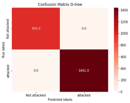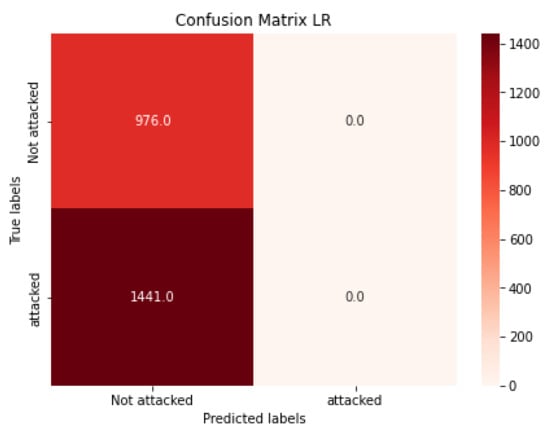 Second, we analyzed the performance of the applied AI models with respect to predicting cyberattacks for commercial UAM. From Figure 10, it is at most clear that KNN predicted successfully the attacks in UAM. Furthermore, the KNN model also predicted the true positive and true negatives of the attack data and no attack data, as is shown in Figure 10. Figure 11 illustrates that the prediction from the logistic regression model was not entirely correct. Additionally, Figure 11 demonstrates that the model predicted the true positive class correctly but could not predict the true negatives. In that case, the logistic regression model incorrectly predicted the negative class. From Figure 12, it is evident that the random forest classifier accurately predicted the attacks in UAM by the attackers. In addition, the random forest classifier model predicted genuine true positive and true negative values for the attack data and no attack data, as depicted in Figure 12. In Figure 13, the random forest classifier correctly predicted the attackers’ strikes against UAM. In addition, as indicated in Figure 13, the decision tree classifier model accurately predicted the real true positive and true negative values for the attack data and no attack data. Figure 14 implies that the LSTM model could not successfully predict the accuracy of the attacks on UAM. Additionally, it reveals that the model accurately identified the true positive class but could not predict the true negatives. Therefore, the logistic regression model incorrectly predicted the negative class.