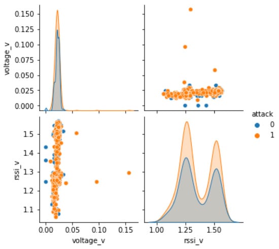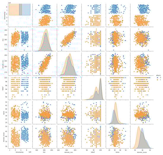 Then, we analyzed the impact of detected cyber threats on the parameters of the switching state (px4io) and radio status of the UAVs. In particular, we analyzed the characteristics of the servo rail voltage and RSSI pin voltage for jamming, spoofing, and benign cases. Furthermore, we analyzed the parameters of the RSSI, remote RSSI, transmit buffer, noise, and remote noise effect on jamming, spoofing, and benign cases. Figure 15 shows the impact of the RSSI voltage on the switching states during jamming and spoofing attacks via the developed exploratory framework. A higher value for the RSSI voltage caused a powerful attack in UAV operation, since the control of the UAV was jammed by the attacker. Figure 16 shows the pair plot analysis between the attack and radio status signal. This correlation indicates the possibility of a strong attack in the received signal strength indicator and remote RSSI. Figure 16 also provides evidence that the attack takes place in the received signal strength indicator as well as the remote RSSI.